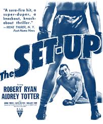 ESTA NEGRA Y CORTA THE SET-UP (1.949) DEL NOTABLE ROBERT WISE ES EXCELENTE: ROBERT RYAN ESTA SOBERBIO COMO ESTE FRACASADO BOXEADOR QUE LE ECHA VALOR AUNQUE ESO LE CUESTE SER APALIZADO Y LESIONADO POR UNOS HAMPONES. ESTAMOS ANTE UN RETRATO IMPLACABLE SOBRE EL SINIESTRO MUNDO DEL BOXEO POR LO MENOS DE CUANDO SE RODO ESTA PELICULA TODO UN CLASICO DE GENERO MUY RECOMENDABLE.
